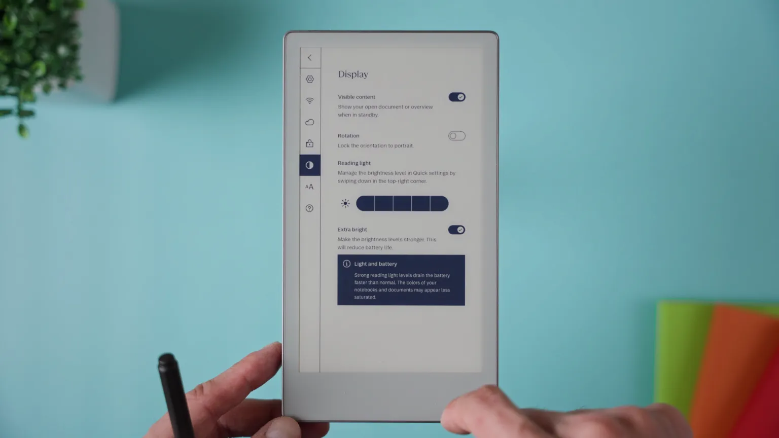 To change the front-light brightness, open the Quick Settings menu by tapping the battery icon or swiping down from the upper-right corner. You’ll see a slider to adjust brightness instantly.